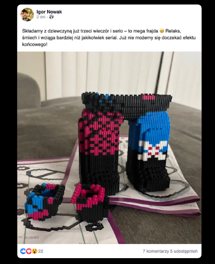 To zależy od tempa budowania – większość osób spędza na składaniu kilka godzin. Można potraktować to jako weekendowy projekt albo podzielić sobie pracę na kilka spokojnych wieczorów.